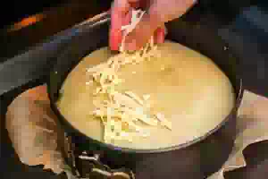 6. Дно разъемной формы для пирога диаметром около 30 см застелить пекарской бумагой, смазать вместе со стенками растительным маслом. Можно дополнительно припудрить дно и стенки мукой. Вылить в форму примерно половину теста, стараясь обращаться с ним как можно бережнее, чтобы сохранить её пористую, пышную структуру. Аккуратно распределить по дну.