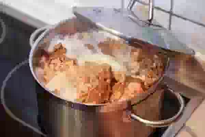3. Промытые строчки сложить в кастрюлю, залить водой и довести до кипения. Откинуть на дуршлаг, еще раз промыть, повторно сложить в кастрюлю, залить водой, довести до кипения, после чего посолить и варить в подсоленной воде на среднем огне 30 минут.