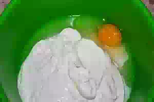 1. В глубокую миску поместить 250 мл сметаны, 180 г сахара и одно яйцо. Взбить ингредиенты до однородной консистенции.