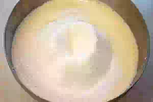 3. В отдельной миске посуде смешать просеянную муку с содой. Мучную смесь примешать к яйцам с кефиром. Тесто для заливного пирога готово.