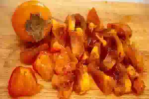4. Для начинки вымыть и обсушить бумажным полотенцем хурму. Разрезать каждый плод на кусочки, снять кожицу и удалить косточки, если есть.