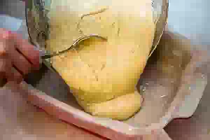 5. Форму для выпечки пирога смазать растительным маслом и застелить пекарской бумагой. Выложить в подготовленную форму половину наливного теста и разровнять ложкой.