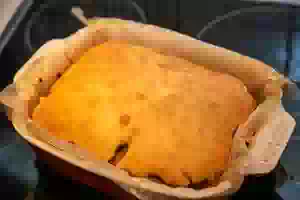 8. Ставим форму с тестом в прогретую до 180С духовку примерно на 1 час. Ориентируйтесь по своей духовке! Готовность пирога можно проверить деревянной зубочисткой: если лучина выходит из теста сухой, значит, заливной пирог пропекся. Готовый пирог остудить в форме, переложить на блюдо и порезать на кусочки.