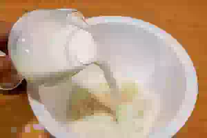 1. Для теста смешиваем половину просеянной муки с сахаром, солью и сухими дрожжами. Подливаем молоко комнатной температуры и растительное масло. Перемешиваем.