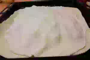 6. Раскатываем из 2/3 теста тонкий пласт. Переносим тесто на противень