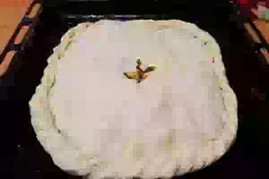 10. В центре пирога делаем надрез, через него будет выходить пар из начинки при выпечке пирога. Отправляем противень в разогретую до 190С духовку на 35-40 минут. Точное время выпечки пирога зависит от вашей духовки.