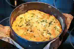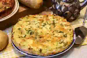 7. Поставить в разогретую до 200С духовку на 30 минут. Я ставила сразу 2 таких формы, и они были готовы через 45 минут. Точное время выпечки будет зависеть от вашей духовки и толщины смаженки. Как только она увеличится в размере, подрумянится, можно проверять её готовность. Подавать готовую смаженку с картошкой и сыром горячей или остывшей.