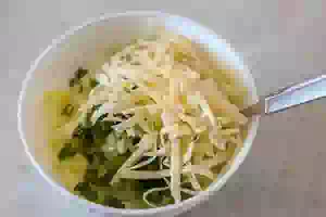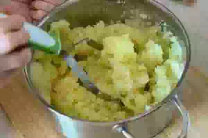 3. Смешать пюре с сырым яйцом, тертым сыром и рубленой зеленью. Посолить и поперчить по вкусу. Картофельная начинка для смаженки готова.