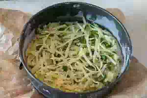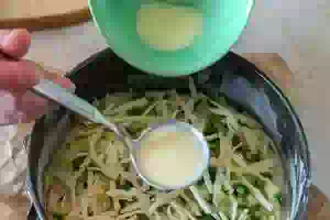 6. Для заливки смешать сметану и яйцо, посолить и поперчить. Вместо сметаны можно взять майонез. Распределить заливку поверх начинки. Её должно быть достаточно много, чтобы вся начинка была её покрыта.