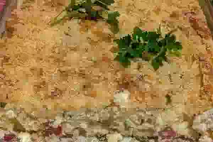 6. Засыпаем верх картофельной запеканки оставшимися крошками (именно крошки и тёртый сыр дадут сицилийскому пирогу такую красивую и хрустящую корочку) и отправляем форму в духовой шкаф, разогретый до 190С примерно на 1 час. Сицилийский картофельный пирог должен равномерно подняться и покрыться тёмно-золотой корочкой. Оставляем пирог на 10 минут в приоткрытой духовке, потом достаём форму, разрезаем сицилийский пирог на порционные куски, украшаем зеленью и подаём с овощами и различными соусами. Если честно, он очень вкусный и сам по себе. Попробуйте.