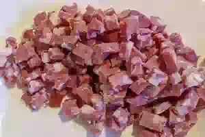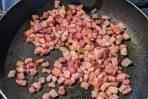 1. Очищаем картофель и варим до готовности в чуть подсоленной воде. Пока картофель варится, подготавливаем остальные ингредиенты. Бекон нарезаем мелкими кубиками и обжариваем на сухой сковороде 5 минут.