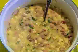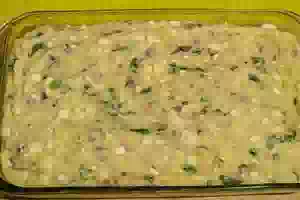 4. Яйца размешиваем вилкой или венчиком. Сливаем воду с картофеля, добавляем в него почти всё сливочное масло (немного надо оставить для смазывания формы) и льем горячее молоко. Почему горячее? Потому что так пюре будет более гладким и пышным. Следом выливаем в немного остывшее пюре яичную смесь и еще раз размешиваем. Потом кладём бекон, салями, измельченный чеснок, творожный и тёртый твёрдый сыр, лук. Перчим, солим по вкусу и снова перемешиваем.