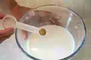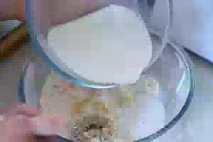 1. Замесить тесто для пирожков. Для этого в теплом молоке размешать сахар, несколько столовых ложек муки и засыпать сухие дрожжи. Снова размешать и прикрыть миску пищевой пленкой или полотенцем. Оставить на 15-20 минут, чтобы проверить дрожжи. Если за это время они начнут работать, появится пенная шапочка, значит все в порядке.