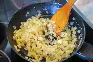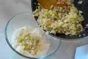 8. Добавить капусту и обжаривать её вместе с луком на слабом огне до мягкости. Можно влить немного воды и тушить капусту под крышкой, а потом, когда она будет почти готова, быстро обжарить. Переложить капусту с луком на тарелку, чтобы она быстрее остыла.