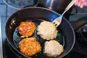 10. В сковороде разогреть растительное масло, уменьшить огонь до совсем небольшого и двумя чайными ложками выкладывать тесто на сковороду. Жарить ленивые пирожки с двух сторон, пока они не подрумянятся и не раздуются. Можно подержать их немного под крышкой, но следите, чтобы образующаяся на крышке влага не капала в сковороду, иначе масло начнет разбрызгаться во все стороны. Готовые ленивые пирожки с жареной капустой переложить на бумажные полотенца, чтобы убрать излишки масла. Подавать горячими, как и обычные пирожки, или дать им остыть, и есть эти пухлые мини пирожки или оладьи как закуску.