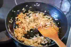 7. В сковороде разогреть растительное масло (1-2 ст.л.) и обжарить лук.