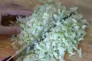 6. Пока подходит тесто, приготовить начинку. Лук мелко порубить. Капусту нашинковать или порезать шашечками, как вам больше нравится.