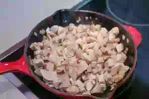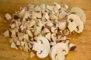 1. Приготовить начинку для жареного пирога. Свежие грибы (у меня шампиньоны, но подойдут любые) вымыть, обтереть салфеткой, при необходимости почистить. Грибы нарезать небольшими кусочками или пластинками. Лук очистить и мелко нарезать.