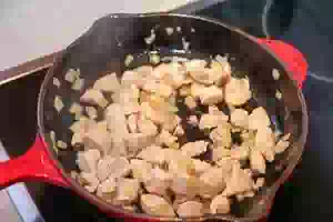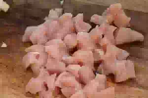 2. Филе курицы сполоснуть под холодной водой, обсушить на бумажных полотенцах и нарезать маленькими кубиками.
