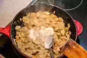 5. Добавить к мясу с грибами сметану, размешать и немного потомить на слабом огне, время от времени помешивая, чтобы грибы не пригорали. Посолить и поперчить по вкусу. Снять сковороду с плиты, начинка для пирога готова.