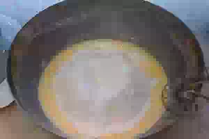 9. Прогреть сковороду. Дно и стенки сковороды диаметром 20 см смазать растительным маслом. Выложить половину теста и выставить самый маленький нагрев.