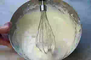 7. Продолжая работать венчиком, добавить в яичную смесь просеянную муку, смешанную с разрыхлителем.