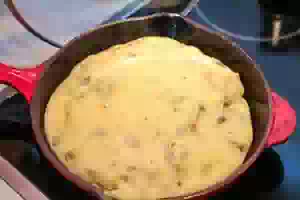 12. Закрыть сковороду крышкой и жарить пирог на маленьком огне 20 минут или пока верх пирога настолько уплотнится, что тесто перестанет липнуть к рукам. На фото видно, что пирог сверху стал как будто вареным. Если на крышке появится конденсат, убрать его бумажным полотенцем.