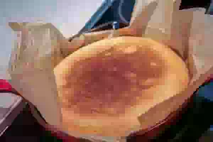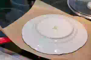 13. Лист пекарской бумаги смазать растительным маслом и накрыть им пирог. На бумагу положить плоскую тарелку и перевернуть сковороду, чтобы пирог оказался на бумаге.