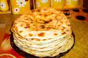 4. Примять пальцами до состояния лепешки. Раскатать в блин мм. 4 (тут уж не до фотоаппарата было)) Выпекать на сухой толстостенной сковороде под крышкой. Когда будет вздуваться - протыкать ножом. Обильно смазать растопленным сливочным маслом и сложить стопочкой. И быстрей хомячить))) Угощайтесь)) Получилось 14 шт.