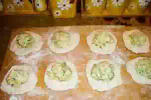 2. Из теста сделать лепешечки, положить начинку. Много.