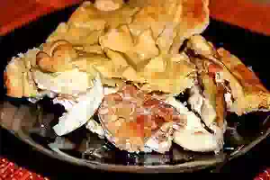 Смазать сливками или яйцом и поставить в горячую (200 С) духовку сначала на 15 минут. Затем температуру снизить (180 С), накрыть пергаментом, или фольгой и оставить в духовке примерно на 1 час. В готовый горячий ‘пирог’ через отверстие в ‘крышке’ влить ещё 200 мл подогретых сливок. Годится как в тёплом, так и в холодном виде.