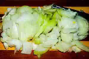2. Одну большую луковицу нарезать как угодно и обжарить на растительном масле до прозрачности. Выложить в подготовленную для запекания форму. Далее взять полиэтиленовый или бумажный пакет, насыпать в него немного муки, подсолить её и закинуть туда куски курицы. Проделать уже знакомую нам процедуру панировки, энергично потряся пакет. Обвалявшиеся в муке куски птички обжарить в масле на сильном огне до золотистого цвета. Выложить слоем на лук.