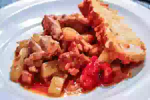 4. Переложила кусочки курицы в форму, добавляется чеснок и майоран, жарится минутку. Потом добавляется вино, вино, смешанное с мукой, томаты с соком. Соли - совсем капелюшку, так как грудинка соленая и томаты у меня оказались тоже. Тут же добавляется и джем.