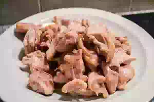 1. Освободила от кожи и костей куриные бёдра, порезала на 6 частей. Грудинку нарезала небольшими кубиками. Кабачок очистила, удалила семена и нарезала крупными кубиками. Лук и чеснок измельчила.