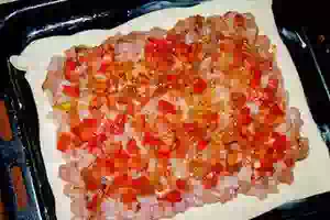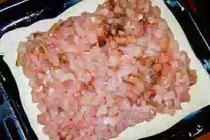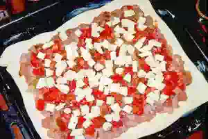 2. Филировать курицу, нарезать мелкими кубиками, посолить, присыпать черным перцем и порошком копчёной паприки. Выложить на тесто слой мяса, разровнять.