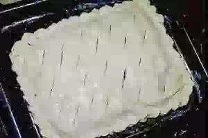 1. Замороженный маргарин быстро потереть на тёрке в муку. Отдельно разболтать яйцо с уксусом и водой. Продолжая рубить тесто, вылить в него получившуюся смесь. Всё хорошо вымесить и убрать в холод на полчаса. Охлаждённое тесто разделить на две части. Раскатать. Разложить один пласт на противне. Смазать тесто сливочным маслом.