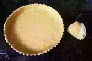 4. Большую часть теста раскатать в пласт и переложить в форму для запекания. Меньшую часть обернуть пищевой пленкой. Убрать тесто и форму в холодильник.