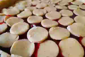 10. Из теста раскатать пласт толщиной около 5 мм и вырезать любые фигурки. Например, кружочки, как показано на фото. Ими будем украшать верх пирога. Распределить эти кусочки теста поверх начинки.