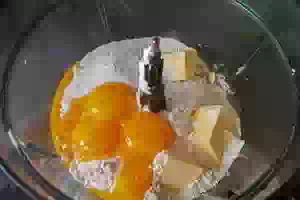 2. Добавить желтки (или 1 крупное яйцо) и замесить однородное тесто. Если Вы готовите в комбайне, то эти этапы можно совместить и пробить сразу все ингредиенты.
