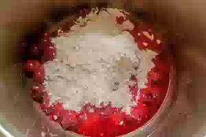 6. и пересыпать к вишне. Хорошо перемешать и поставить готовиться на средний огонь.
