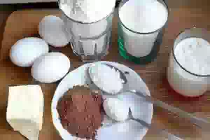 1. Перед тем как приготовить бисквитный пирог с шоколадным кремом, подготовьте все необходимые ингредиенты. Очень удобно, когда всё под рукой и не нужно в процессе приготовления отвлекаться на поиск ингредиентов. Духовку включите для разогрева до 180 градусов.