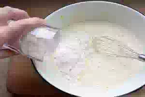 4. Введите пшеничную муку, смешанную с разрыхлителем, и перемешайте.