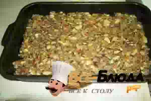 12. Берем форму для выпекания, выкладываем на дно начинку из грибов, овощей и фарша.