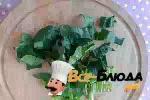 1. Приготовление пирога со шпинатом начинается с начинки. Для этого отрежьте корешки у листьев шпината, предварительно хорошо промыв листья от грязи. Нарежьте листья и черешки на кусочки около 1 см шириной.
