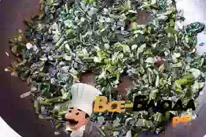 3. Мелко порежьте и поджарьте 1 луковицу до прозрачности на оливковом масле. Добавьте стакан шпината, жарьте, помешивая еще 2-3 минуты.