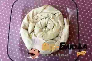 8. Сверните пирог рулетом. Точно также сделайте и со вторым листом теста. Выложите оба рулета по спирали в смазанную растительным маслом форму.