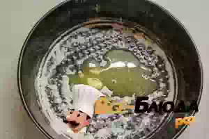 1. В миске растереть миксером 3 крупных куриных яйца и полстакана сахара, пока масса не станет светлой и однородной.