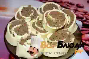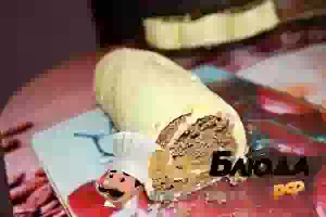 8. Аккуратно свернуть рулет. Острым ножом нарезать рулет с печенью в яичном тесте на порционные куски и уложить на сервировочное блюдо.