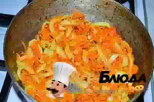 1. Приготовить начинку. Для этого, нарезать полукольцами лук, крупно натереть морковь. Говяжью печень вымочить в воде или молоке, нарезать средними кусочками. В сковороду влить немного растительного масла, раскалить его, положить лук и морковь. Жарить на средне огне до золотистого оттенка.