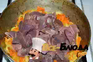 2. Затем отправить в сковороду куски подсоленной печени. Периодически помешивая, тушить на слабом огне около 15 минут.